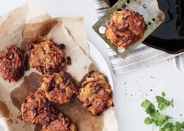 Hanukkah is around the corner. That means it’s time to get our best latkes recipe on! The humble potato pancake is a traditional Hanukkah food loved by Jews and non-Jews alike, and with good reason. Who can resist crispy fried cakes of shredded potato and onion served with sour cream or applesauce? Certainly not me.But what if we veered off the traditional path? What if we maintain the basic principles of latke-making, but ditch the classic recipe, which calls for little more than potato, onion and egg? Then…magic, is what.