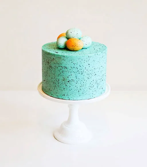 Inspired by the color and texture of a robin’s egg, this Speckled Easter Egg Cake (above) from The Cake Blog is out of this world gorgeous. Carrie starts with a 4 layer vanilla cake and basic vanilla buttercream. Then she gets to work with her speckled egg technique, which she demonstrates in this DIY tutorial with photos for every step. Carrie’s the mom to a little one, so she also breaks down how to make this cake over the course of several days.