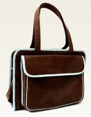 Of course, all of this organization wouldn’t be enough to convince me if if the bag looked like something the hospital gave out for free. With chocolate brown or cherry red microsuede and a smart, tailored design that accommodates most laptops, I expect I’ll still be carrying this bag even when my youngest is out of diapers. Which will be in about three years. If I’m lucky. -Julie