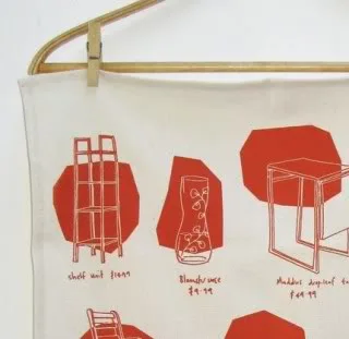 The natural-toned 100% cotton loose weave fabric is covered in burnt orange sketches of the various vowel-impaired home goods. It is as cute as it is clever, and I would pair it with her vintage-style mugs towel in blueberry to create a funky look in my already colorful kitchen.
