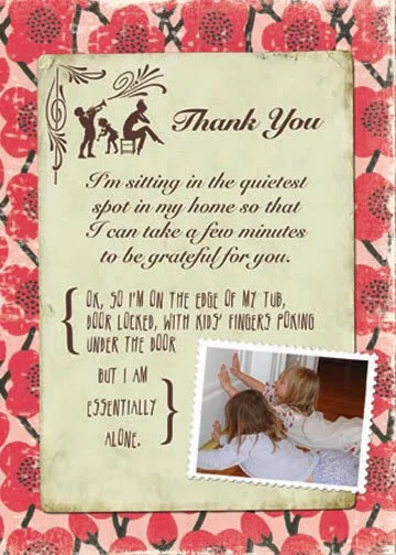 My favorite one reads I’m sitting in the quietest spot in my home so that I can take a few moments to be thankful for you. Ok, so I’m on the edge of my tub, door locked with my kids’ fingers poking under the door. But I am essentially alone.