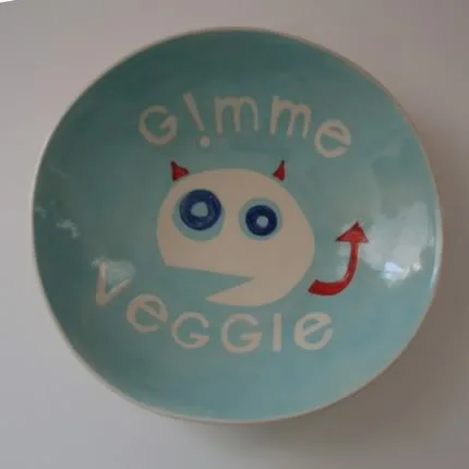 Considering I have yet to figure out the formula that will make my son eat even one vegetable consistently without tossing it at my head, I’m willing to try anything, like this Gimme Veggie bowl from London trained clay artist May Luk.