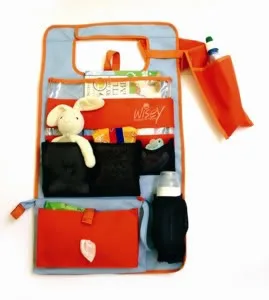 But my newest obsession is their car bag (pictured) which hangs over the passenger seat and allows you to grab the sippies, snacks, and 20 other things your kids want while you’re driving and would prefer not to root through your diaper bag or worse, reach blindly around the backseat with your non-driving hand.