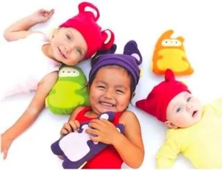 And if you have any idea what I’m talking about you’re evidently familiar with the brand kids label, Muddy Cloud. Designer Joy Limanon Anaya and her husband Matt have created this family of five colorful, Teletubby-esque soft fleece dolls, each of which coordinates with a hat and pair of mittens in the same color and shape.