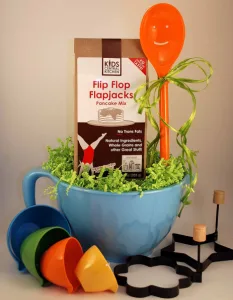 the turquoise mixing bowl is Kid Central Kitchen’s own low-sugar, wholegrain pancake mix and some pancake molds in fun shapes. Also