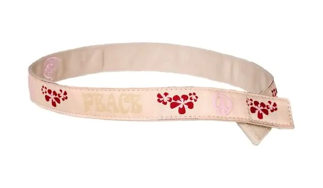 In any case, it’s probably why I got a kick out of the new children’s peace belt from CMP fave Myself Belts. The khaki ribbon is a nice neutral (way less pink than it looks in the photo) alternating with little pink peace signs, the word “peace,” and burgundy flower clusters.
