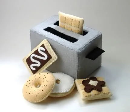 Many of the patterns are food–like the PB&J lunch set or the toaster set shown here (ah, so kids can play with the toaster!), but there’s also a doctor’s kit, tools, a child’s tea set, and even a retro robot plushie.