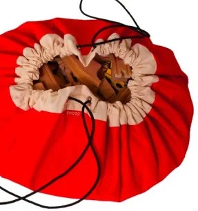 Once the toys are inside the bag, just grab the nylon cords and “swoop” it up into a Santa-like sack which can then be tossed in a corner or hung on a hook up and out of the way. It can even go into a larger toy box and not spill everything all over the place. When the bag is opened, it goes pretty flat which means kids can spread their LEGOS all around it and see almost everything in front of them–no more let’s dump the tub upside down to see what is at the bottom.
