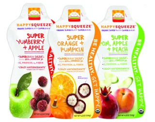 The HappySqueeze pouches are the ultimate eat-on-the-run food, since you just pop the top and start slurping.