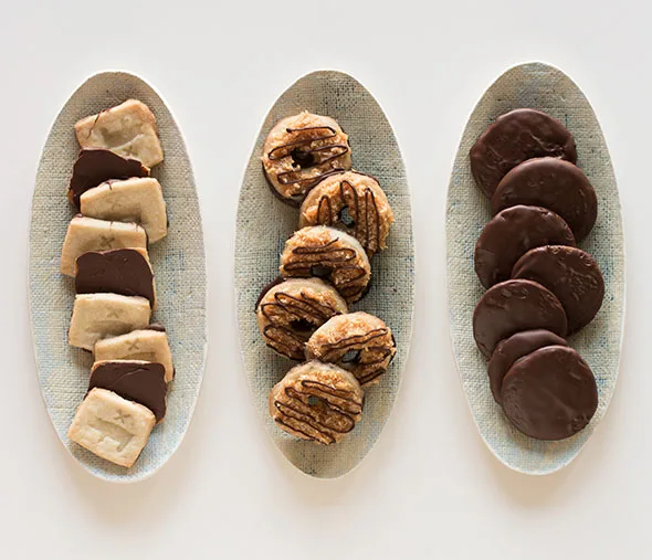 Another fan favorite–especially right from the freezer–Thin Mints are crisp wafers covered in a peppermint chocolate coating. They are just as straightforward to make as they are to describe. Bake a simple chocolate cookie wafer dough and dip in melted chocolate spiked with peppermint oil. Heidi Swanson posted a simple, all-natural Thin Mint recipe on her beloved blog 101 Cookbooks, but dare I offer an even easier recipe?