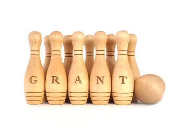 These Personalized Wooden Toy Skittles (no, not the candy) from KeepsakeToys fit the bill perfectly. Durable and plenty of fun for indoor play, this 10-pin wooden bowling set can be personalized with up to