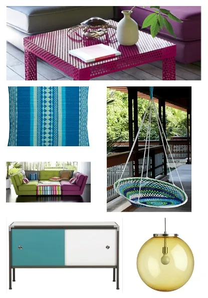 The new Novogratz Brasil collection for CB2, just launched this month, is such a funy, cheery way to brighten up your/my decidedly North American pad, at the decent prices and quality CB2 is known for. I’m loving pieces like a duo-toned credenza, a swing chair that makes me pine for a deck, and a bright fuschia punched-metal coffee table that might not be so great for homework, but is perfect for a family room that’s drowning in neutrals.