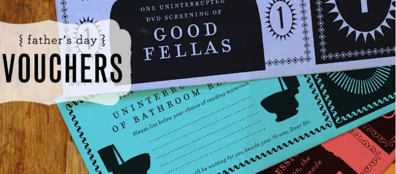 First there are some of the best looking printable Father’s Day coupons I’ve ever seen. Trust me, I’ve searched the web and most look kind of hokey. These happen to be clever and modern, offering a free uninterrupted Goodfellas screening, a coupon to wear whatever you want with no criticism, and even a little spicy from mama.