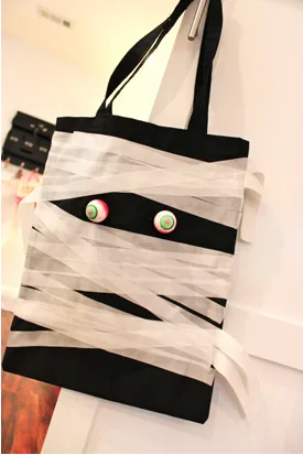 Turn any black bag, paper or cloth, into this Mummified Loot Bag (above) with some first-aid tape taken from the medicine chest. (I know my kids would love to do the wrapping themselves.) In a pinch, I’d just grab some googly eyes from our craft stash, or even hand-draw some eyeballs on cardboard and stick them onto the bag.