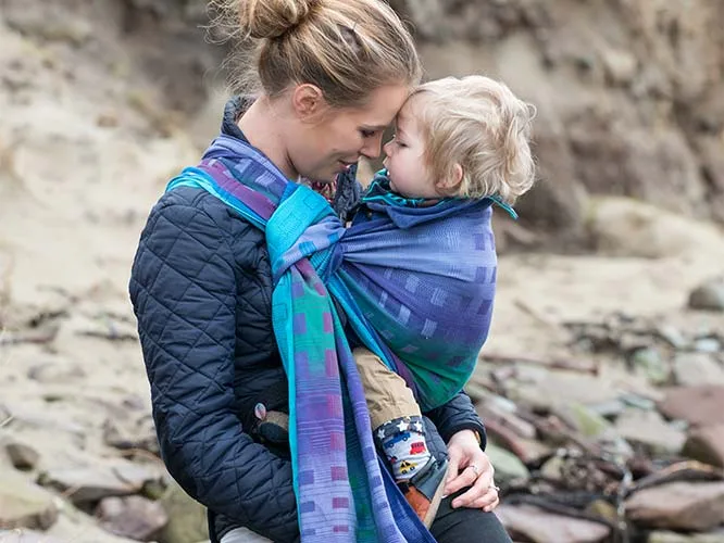 If you’re a ring sling fan, we found some gorgeous options for you too, in the new ring slings at Oscha Slings which blow us away. (Also shown at very top) The colors and patterns are so elegant, with lots of jewel tones and subtle prints. I also really like the variety of luxury fabrics, including bamboo, linen, an organic pima cotton, and an Egyptian combed wool-blend. The one drawback is that these beautiful slings ship from Scotland, so be prepared to pay some hefty shipping fees. But wow, what a dressy accessory to help a new mom feel pretty — and like no other mom in her new mom playgroup.
