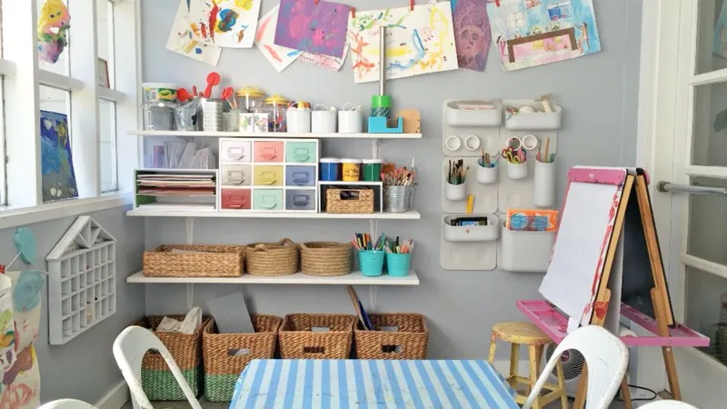 Don’t feel limited to art supplies for your kid’s craft space. Think of it more as a workshop, where your kids can use their art materials to enhance other types of “work” as well. You can include some toy cars, little plastic animals, play kitchen tools, or even blocks. This way, art-making becomes woven into kids’ imaginative play, which can keep them engaged for long periods of time.